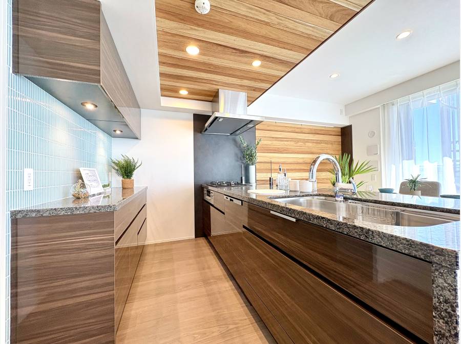 無垢挽き板貼りの壁やエコカラット、天然木の天井など、素材一つひとつにこだわり、落ち着きある演出しています。