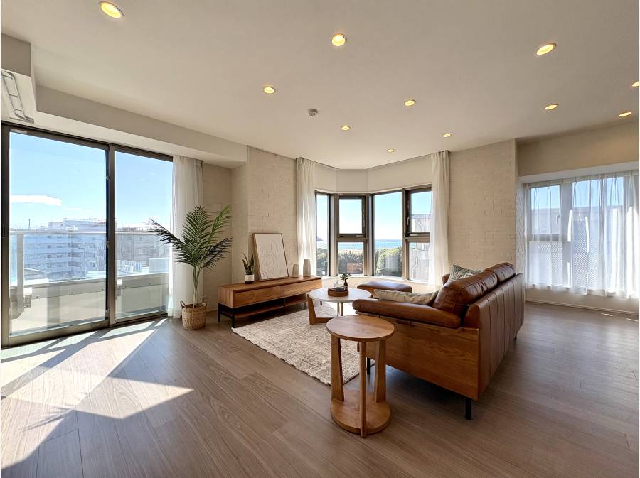 【最上階・角住戸×オーシャンビュー】湘南の空と海を独占する31㎡超のスカイビューテラス。26.6帖のLDKでリゾートライフを。