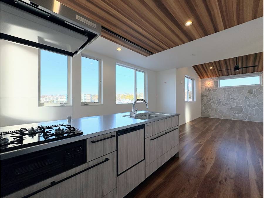約20.8帖もの広さを誇るLDKには、重厚感のある石張りのアクセントウォールと、家族の会話が弾むペニンシュラキッチンを採用。
