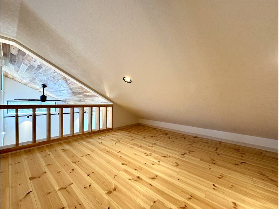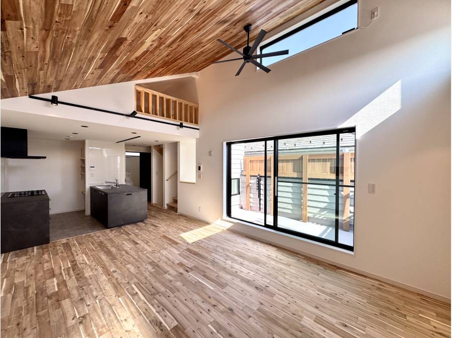 上部吹き抜けの開放感のあるLDKに固定階段で行き来可能なロフトスペース