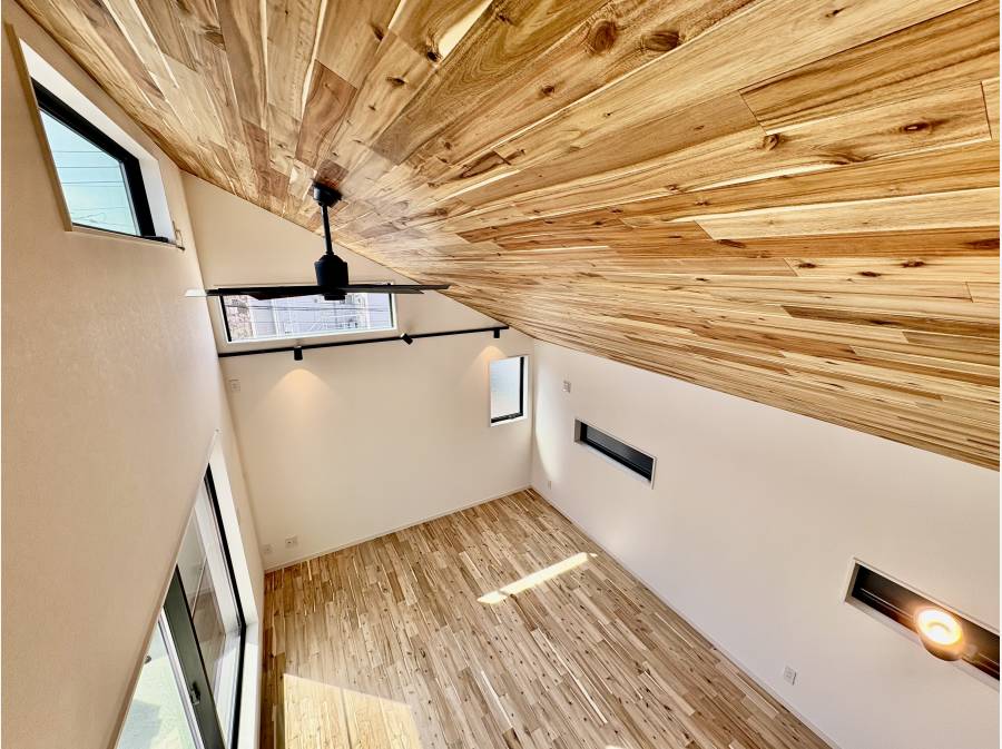 床とリビングの天井はアカシアの無垢材を使用しており、