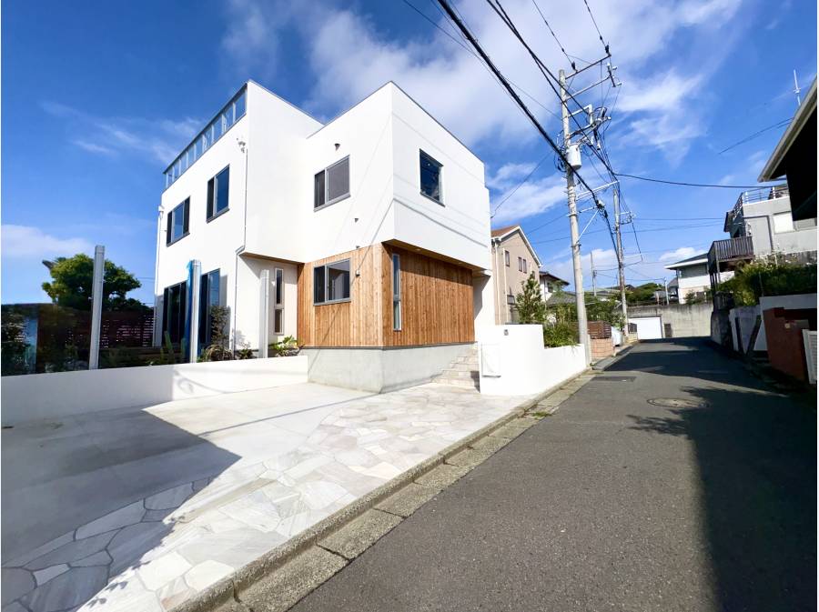 七里ガ浜の空と海に映える、洗練されたモダンな外観デザイン