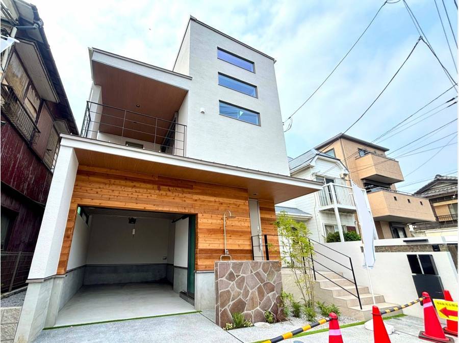 江の島を望む場所に、デザイン性の高い新築ガレージハウスが完成しました。