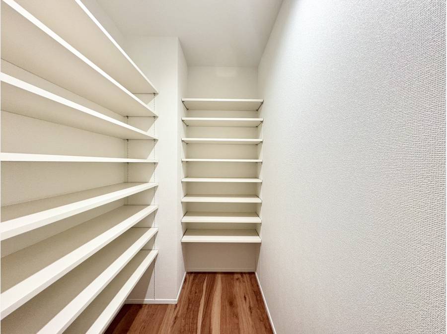 キッチンの裏にはパントリーを完備しているので、食品や日用品をすっきり収納できます