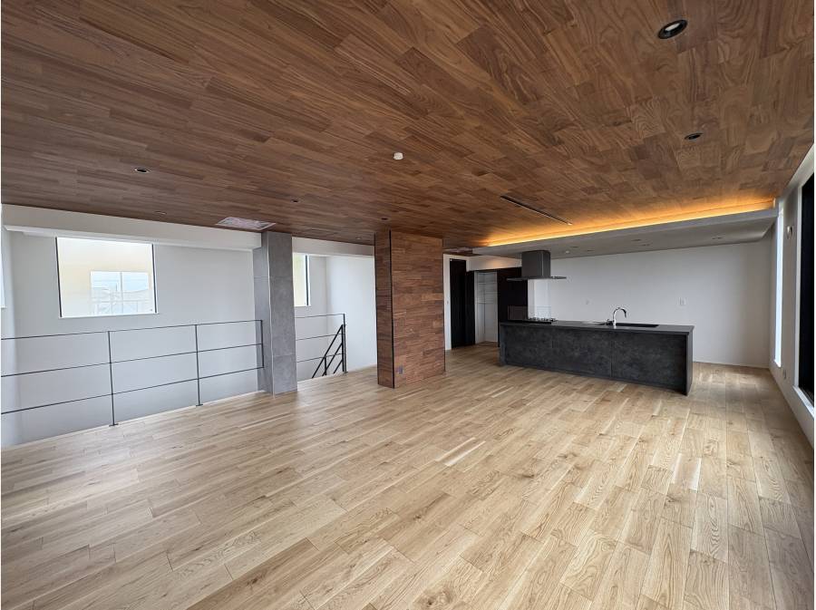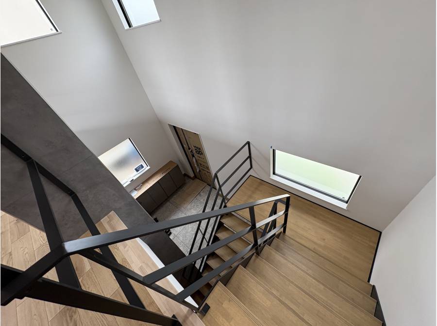 約10帖程の玄関ホールから吹き抜けと一体化されたスケルトンの階段を上りますと、約30帖程のLDKが現れます