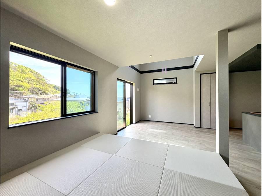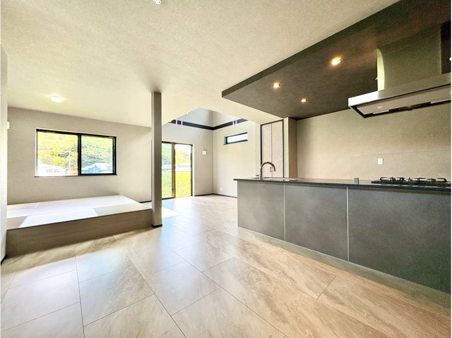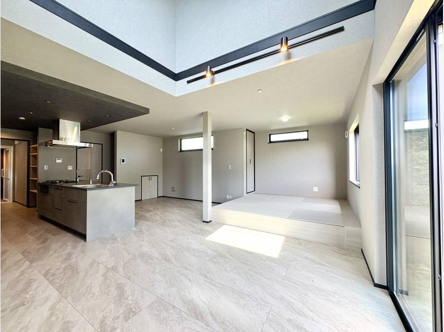 リビングには開放感あふれる吹き抜けを設け、さらに隣接する畳コーナー(4.5帖)が、家族の団らんに心地よい寛ぎを添えます。
