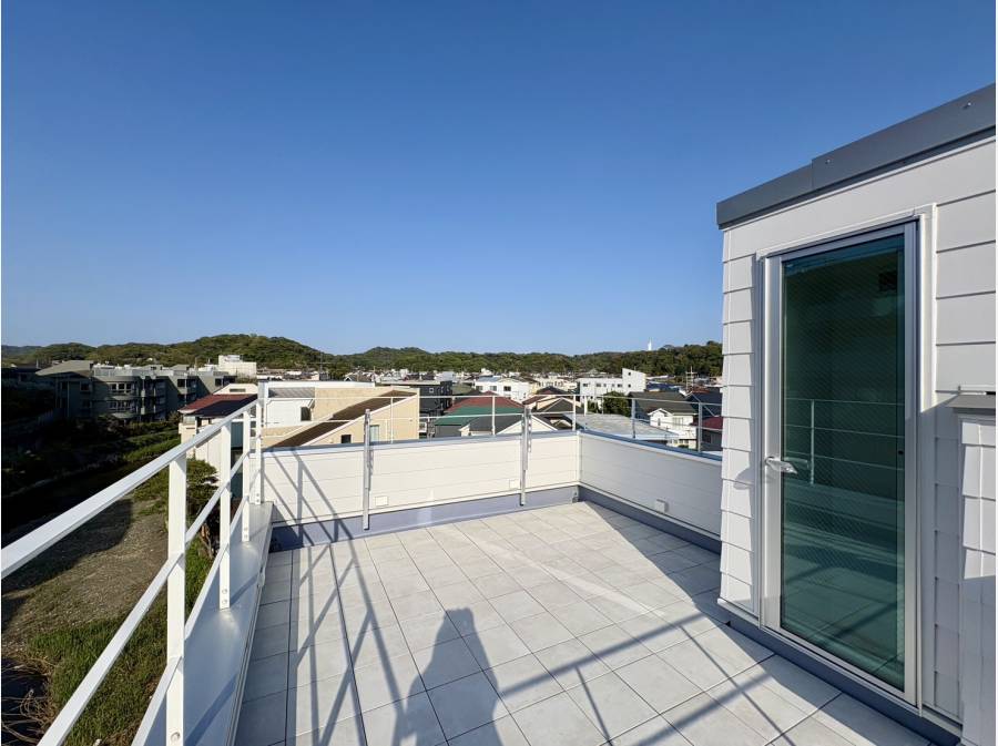 ルーフバルコニーから海を眺める新築邸宅